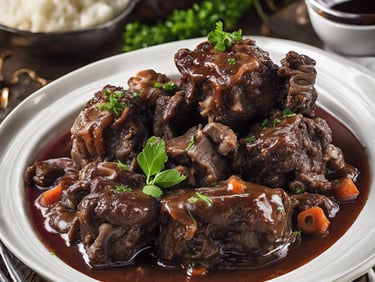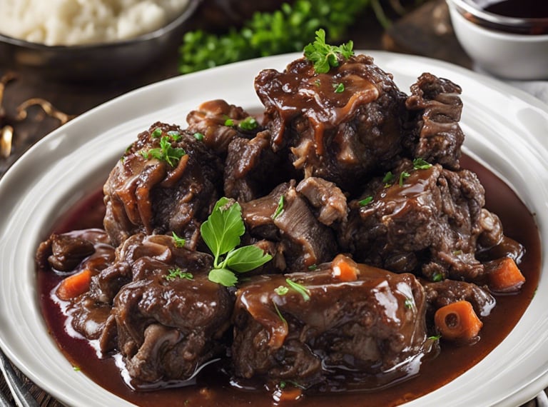 Sumérgete en la exquisitez de nuestro Rabo Estofado al Vino Tinto, un plato tradicional reconfortante con tierna carne de rabo de ternera cocinada lentamente en una salsa de vino tinto aromática. Cada bocado es una explosión de sabor, con la carne que se deshace en la boca y una salsa rica y reconfortante que te hará querer más