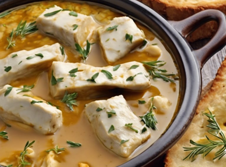 Deléitate con nuestra Cazuela de Bacalao al Pil Pil, un plato emblemático de la cocina vasca. Lomos de bacalao en una salsa pil pil sedosa y sabrosa, acompañados de pan crujiente para mojar. Una experiencia culinaria auténtica y deliciosa que no te puedes perder.
